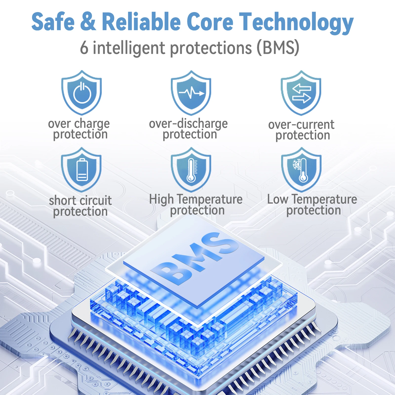 【200A BMS & Low-Temp Protection】 BMS (Battery Management System), over-charging protection, over-discharging protection, high/LOW temperature protection, short-circuit protection, over-current protection. And keep the balance between cells.