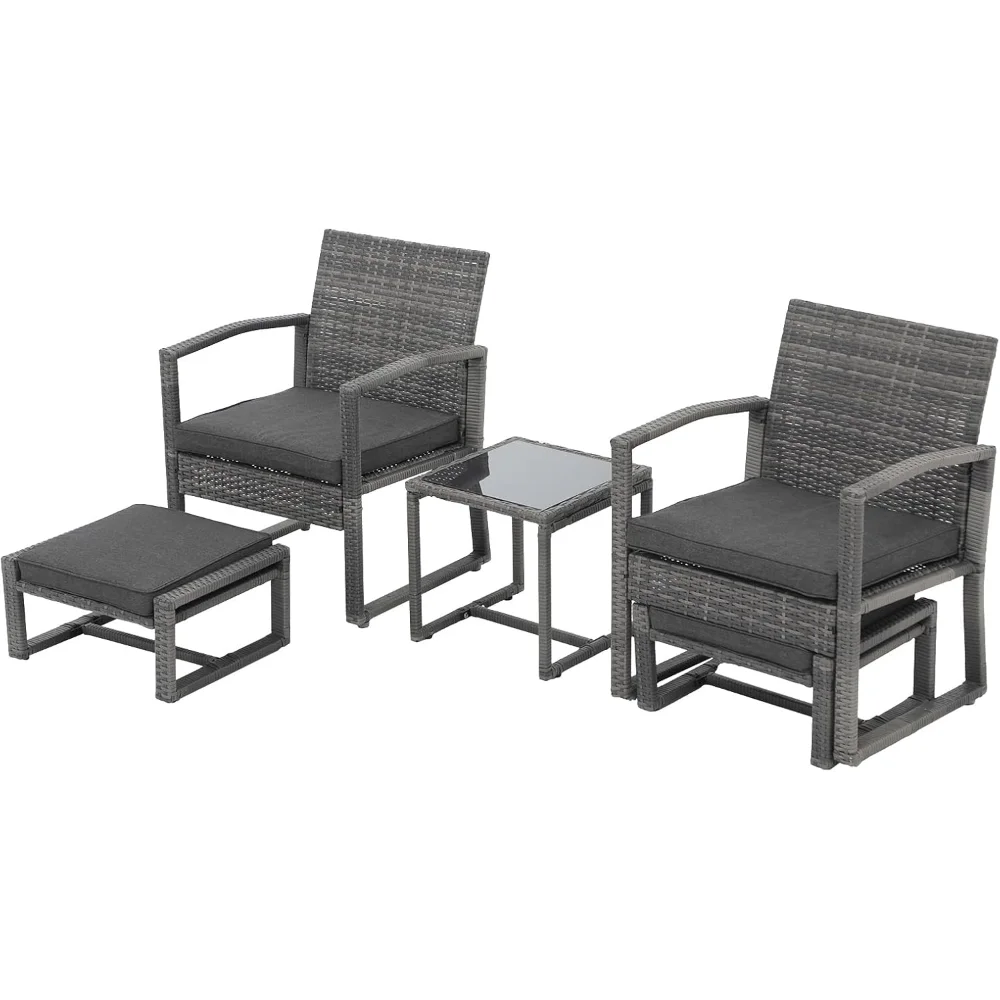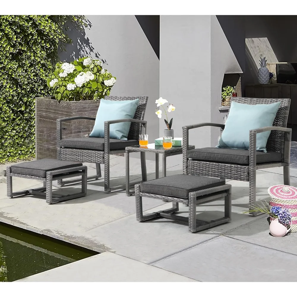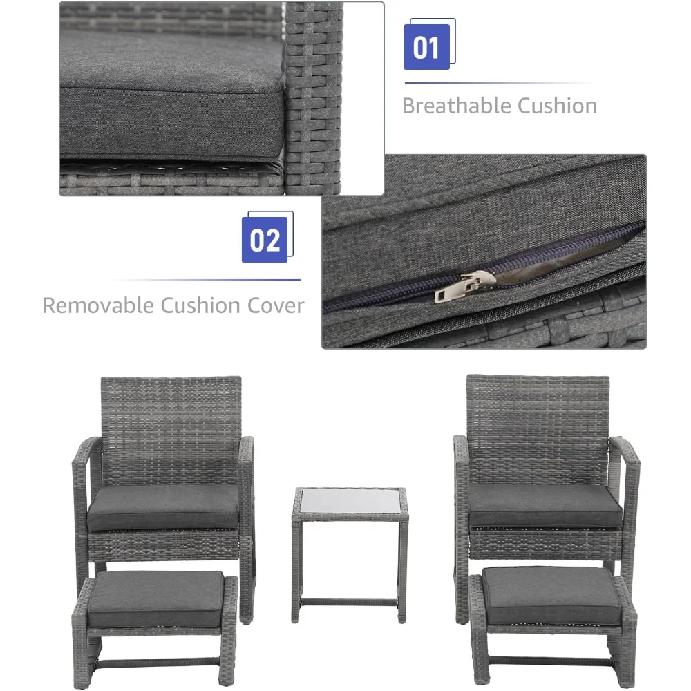 5 Piece Outdoor Patio Wicker Furniture Set, All Weather Grey PE Rattan Chair and Ottoman Footstool Set W/Coffee Table
