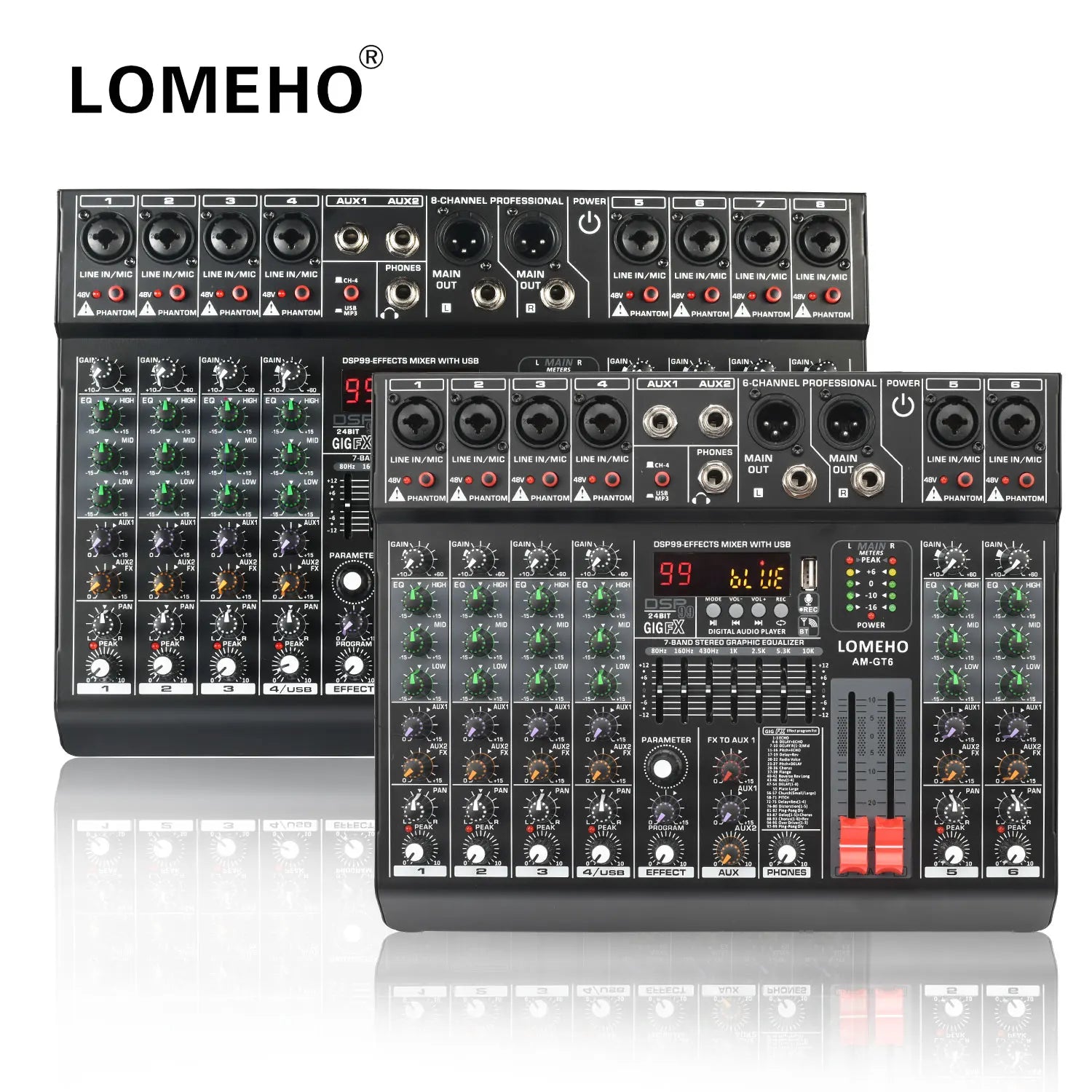 LOMEHO 7 Band EQ Audio Sound Mixer Table 6/8 Channel Mixing DJ Console with USB 2 AUX Output Individual 48V 99 Effect AM-GT6/8