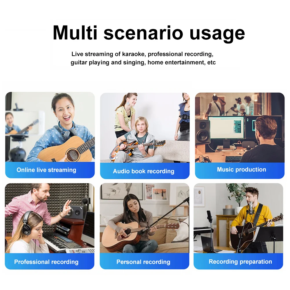 Feature: 1. High-Fidelity Audio Quality: Experience studio-grade audio with a maximum sampling rate of 24-bit/192kHz by sound card, capturing every detail of your recordings with exceptional clarity and fidelity. 2. LOOP BACK Functionality: The MD22 audio interface supports LOOP BACK functionality, allowing you to mix the sound input from the device with the audio being played on the computer, creating a stereo output. Perfect for internet broadcasting. 3. "Zero-Latency" Monitoring: The MD22 recording sound card provides zero-latency direct monitoring, allowing musicians to experience their performances without any delay or lag in the return signal. This ensures optimal playability and recording quality. 4. Stereo/Mono Output: With left and right channel inputs, the MD22 studio sound card accurately reflects the spatial positioning of different sound sources during recording. It supports simultaneous connection of microphones and instruments for music production while allowing recording with accompaniment playback on the computer. It also supports switching between stereo/mono outputs for recording flexibility. 5. 48V Phantom Power and Mic Preamp: This USB portable professional sound card features a built-in 48V phantom power and mic preamp. It can be used in conjunction with standalone premium preamps, offering ample headroom, low distortion, and ultra-low noise. Both mic preamps have independent volume control knobs, signal indicators, overload indicators, and quick fade-in/fade-out buttons. By using condenser microphones, you can inject outstanding clarity and detail into your recordings, making it perfect for guitar pickup or vocal recording. Specification: Certification: NONE Origin: Mainland China Type: Studio Monitoring Model Number: Sound Card Name: 2 in 2 out USB sound card Model: MD22 Color: black silver, red (optional) material: metal Number of preamplifiers: 2 A/D resolution: 24-bit/192kHZ Number of Instrument/Mic Inputs: 2 Phantom Power: 48V DC Connection port: USB Connection protocol: USB 2.0 Analog output: RL Appearance structure: desktop Headphone output: 1 Power supply mode: support USB power supply/TYPE-C Power Supply: Support Type C Compatible PC and IOS Size: 173.00x100.00x48.00mm/6.81x3.94x1.89inch Weight: 0.696KG MD22 small external professional sound card 2 in 2 out USB2.0 driver-free built-in computer recording sound card mobile phone live recording karaoke musical instrument playing and singing support 48V phantom power supply without delay monitoring independent channel gain control 24-bit/192kHz high-fidelity sound quality stereo/mono output Support LOOP BACK (loopback) preamplifier