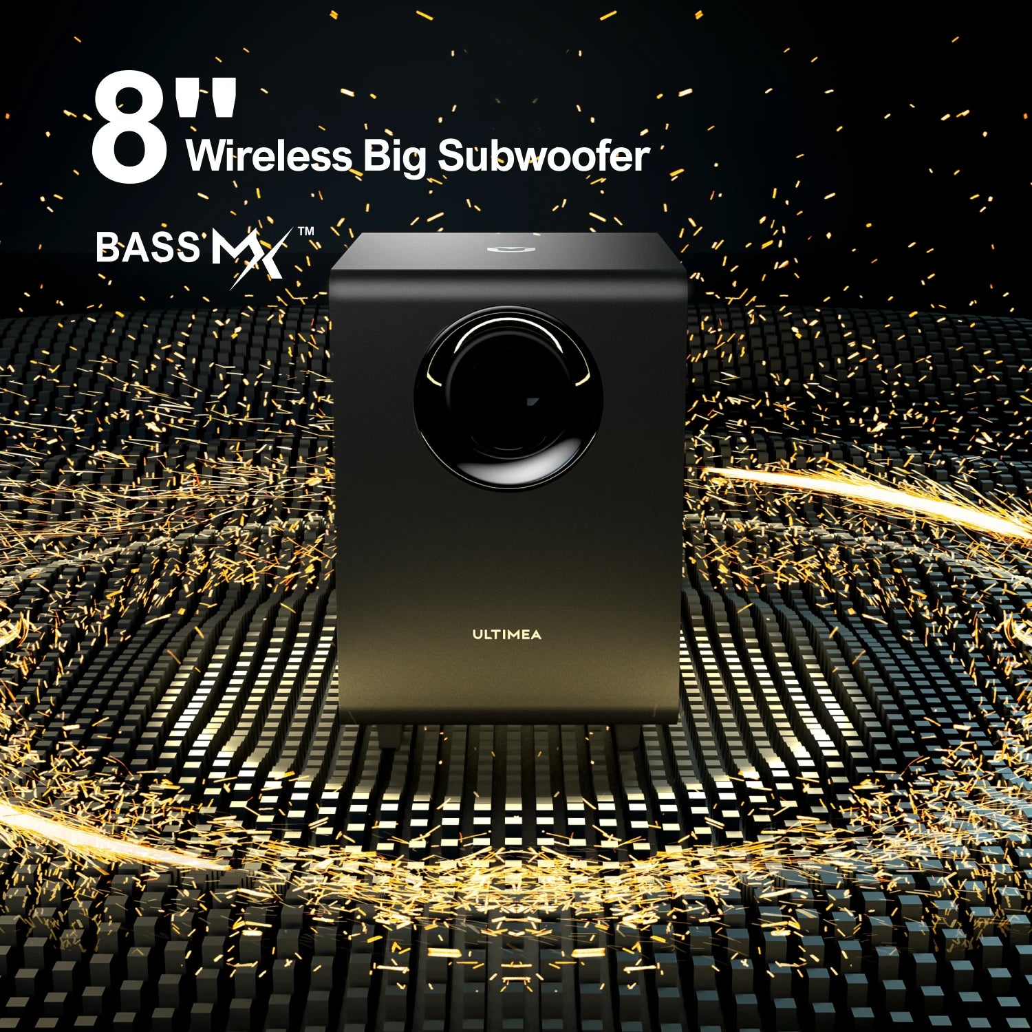 Powered by cutting-edge BassMX technology, the 8-inch wireless jumbo subwoofer features an optimized magnetic circuit and eco-friendly diaphragm housed in a spacious 25L cabinet. With an impressive 18mm diaphragm amplitude, it delivers deep, impactful bass that transforms action scenes and music alike.