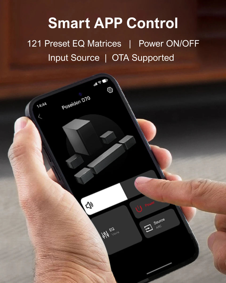 4 Adjustable Surround Speakers: The Poseidon D70 features 2 rear and 2 front speakers, ensuring precise sound projection from the front, back, and sides, enhancing audio spatiality and immersion. The surround speakers' flexible design allows for versatile layouts and enhances space utilization. With 13 adjustable surround levels that elevate your surround sound experience, this soundbar for tv takes your audio to the next level.