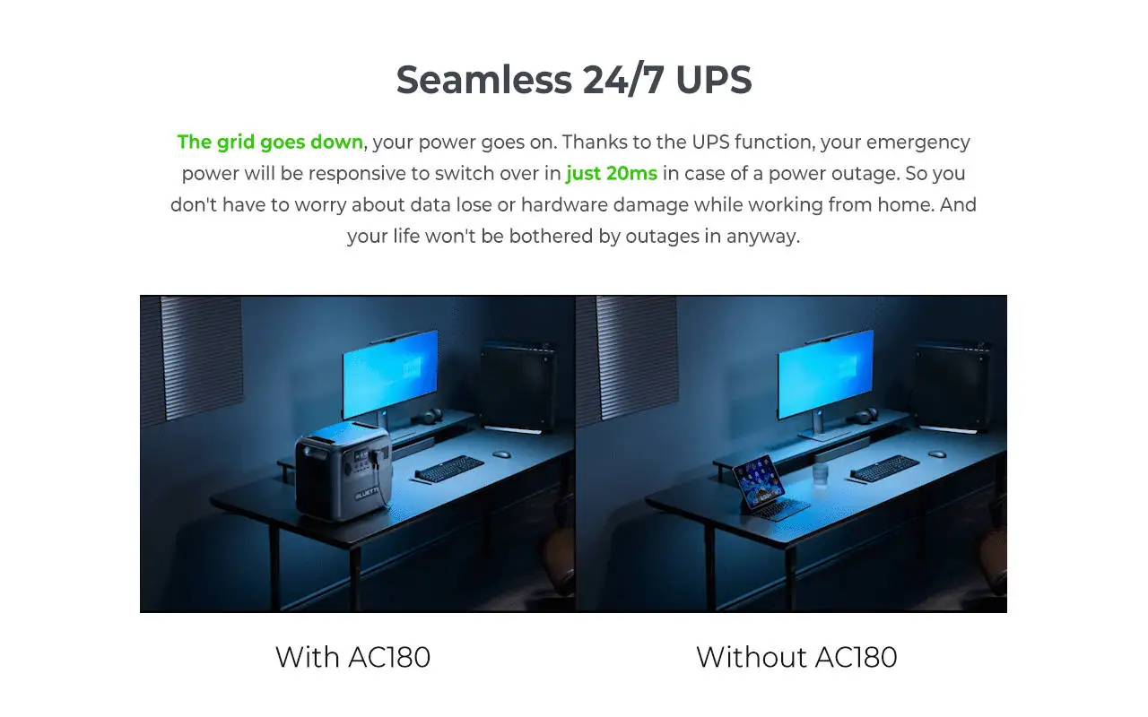 AC180 has an advanced UPS function that restores power immediately with a switching time of 20 ms, so you don't have to worry about power outages.