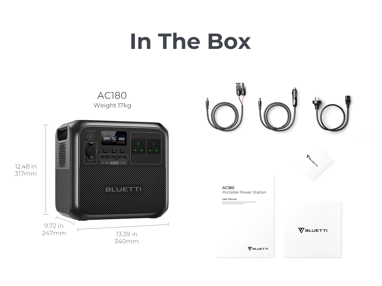 Accessories: AC Charging Cable (AC Input) Car Charging Cable (Car Input) Solar Charging Cable (Solar Input)