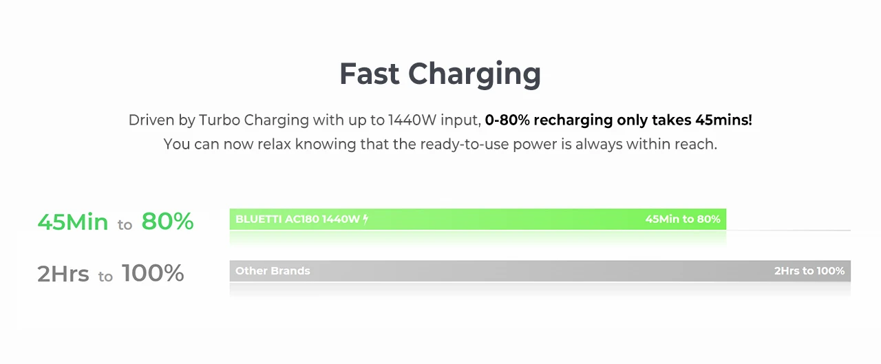 No bulky power supply, a single cable is enough to charge the Bluetooth AC180 with a maximum of 1440 W. 1440 W fast charging power fully charges the Bluetti AC180 1152 Wh in 1.3-1.8 hours.